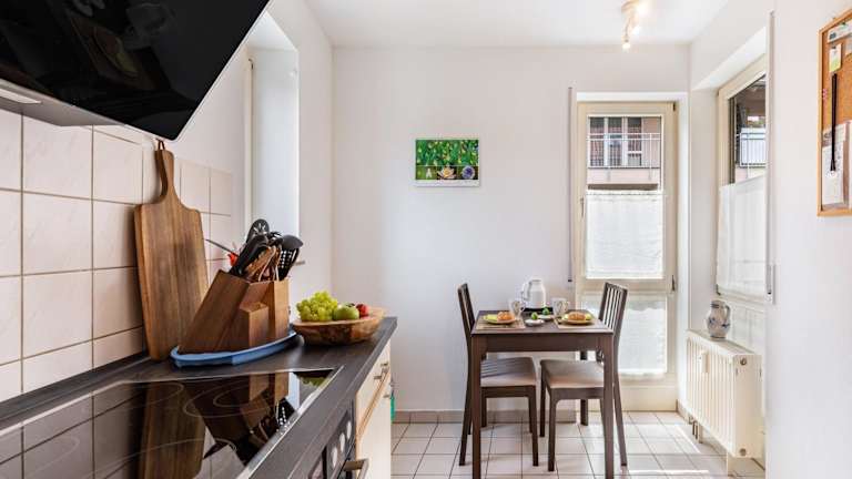 Die Ferienwohnung verfügt über eine voll ausgestattete Küche mit Kühlschrank und Kaffeemaschine, was eine eigenständige Zubereitung von Mahlzeiten ermöglicht. Grillmöglichkeiten stehen ebenfalls zur Verfügung.