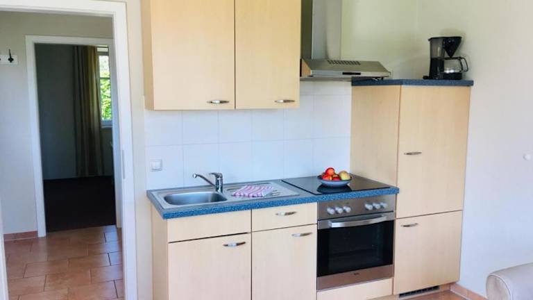 Die Ferienwohnung verfügt über ein Schlafzimmer und eine voll ausgestattete Küche, die ideal für die eigene Verpflegung ist.