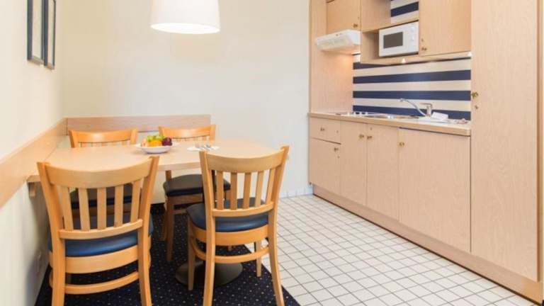 Die Ferienwohnung beinhaltet eine Küchenzeile, die mit einem Kühlschrank, einem Geschirrspüler und einer Kaffeemaschine ausgestattet ist. Handtücher und Bettwäsche werden bereitgestellt.