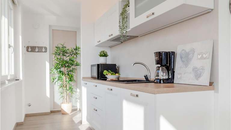 Die Ferienwohnung verfügt über eine gut ausgestattete Küche mit einem Kühlschrank, Geschirrspüler, Mikrowelle und Kaffeemaschine, was Selbstversorgern zugutekommt.
