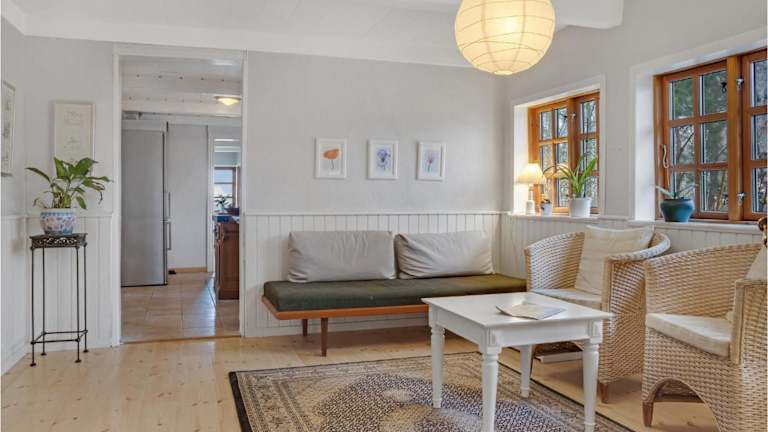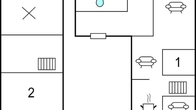 Das Ferienhaus verfügt über zwei Schlafzimmer, ein Wohnzimmer, einen Essbereich und eine Küche mit Kühlschrank. Es hat eine gemütliche Ausstattung und ist ideal für einen angenehmen Aufenthalt.