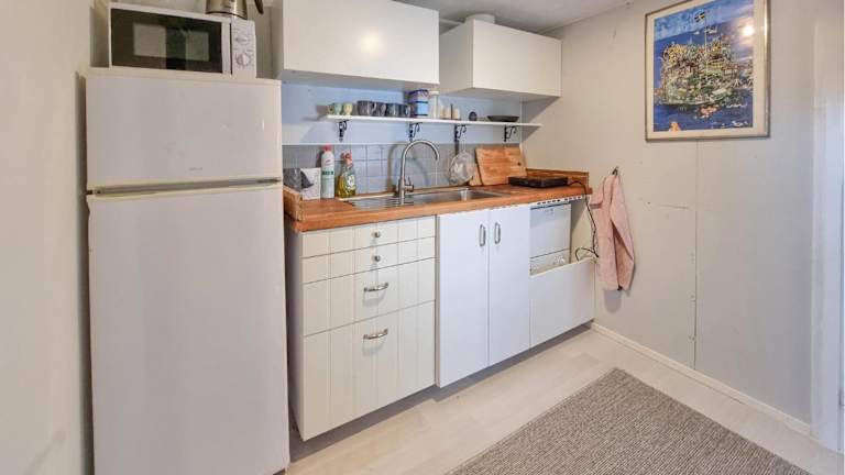 Das Ferienhaus umfasst ein Schlafzimmer und ein Wohnzimmer mit einem Fernseher. Die Küche ist vollständig ausgestattet und verfügt über einen Kühlschrank, um eine unabhängige Verpflegung zu ermöglichen.
