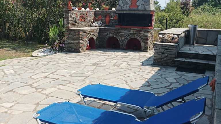 Ammouliani Villa PARADISE besticht durch eine Terrasse und einen heimeligen Garten. Die Ferienwohnung bietet Übernachtungsmöglichkeiten für Gäste und verfügt über Klimaanlage.,