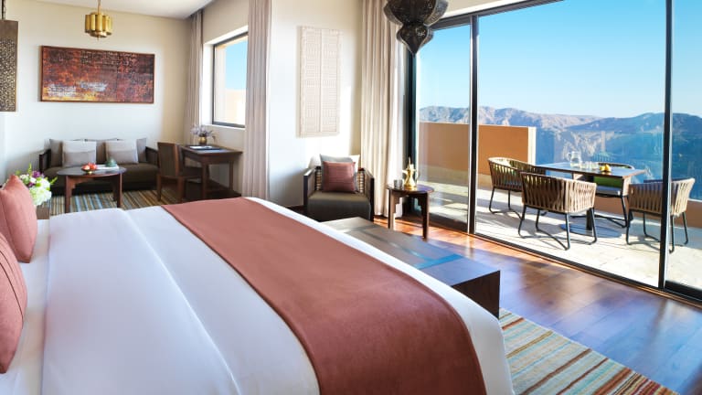 Das Anantara Al Jabal Al Akhdar Resort liegt 2.000 Meter über dem Meeresspiegel am geschwungenen Rand einer großen Schlucht und ist das höchste Luxusresort im Nahen Osten und eines der höchsten der Welt. Das Hotel liegt nur zwei Stunden vom internationalen Flughafen Muskat entfernt