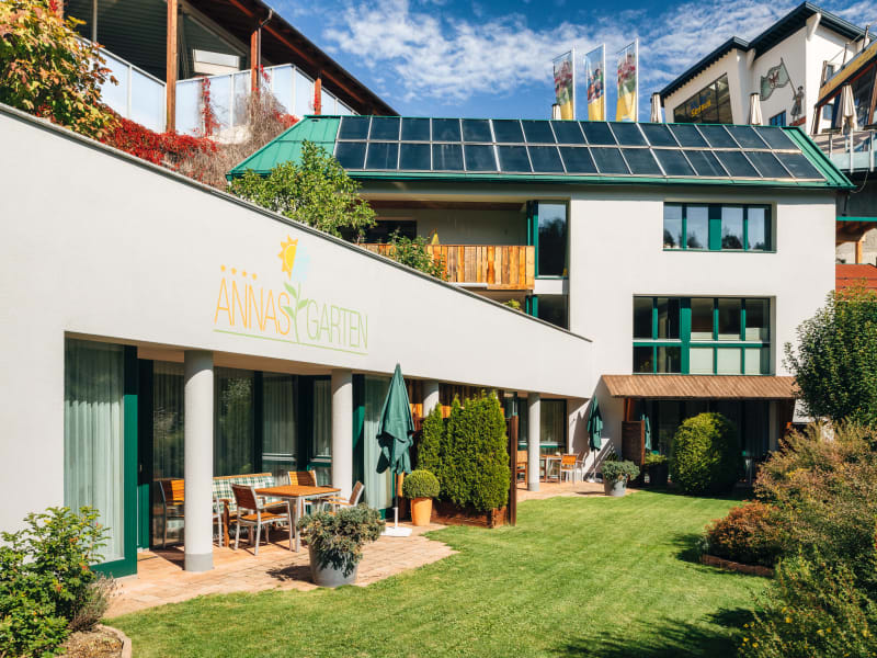 In Annas Garten steht ein *Wellnessbereich mit Sauna/Sanarium, Infrarotkabine, Erlebnisdusche, Ruheraum und Quellwassertrinkbrunnen zur Verfügung*, Schi-/Schuhraum mit Schuhtrockner und Garage sowie Brötchenservice. Hauseigener TOM TANNE-Kinderspielplatz mit Schaukeln, Rutschen, Trampolin, Klettergerüst, Tischtennis, Spielgeräte,... Solar-/Passivhaus, Nichtraucher, keine Haustiere.