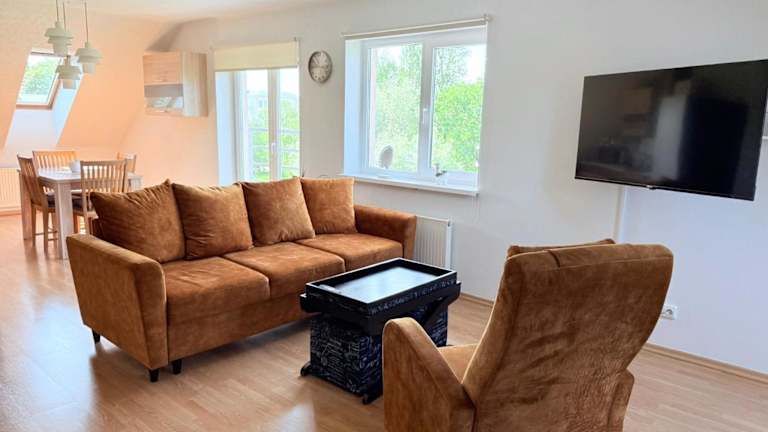 Die Ferienwohnung umfasst 1 Schlafzimmer, ein Wohnzimmer sowie eine voll ausgestattete Küche, die mit einem Kühlschrank und einer Kaffeemaschine ausgestattet ist. Zudem gehört ein Badezimmer mit Dusche und kostenlosen Pflegeprodukten zur Ausstattung. Handtücher und Bettwäsche werden ebenfalls zur Verfügung gestellt.