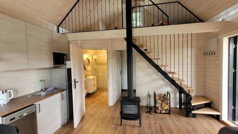 Das Chalet verfügt über eine Terrasse mit Gartenblick, zwei Schlafzimmer, ein Wohnzimmer sowie eine gut ausgestattete Küchenzeile mit Kühlschrank und Geschirrspüler. Ein Badezimmer mit Dusche ist ebenfalls vorhanden. Zur Ausstattung zählen ein Flachbild-TV und Heizung.