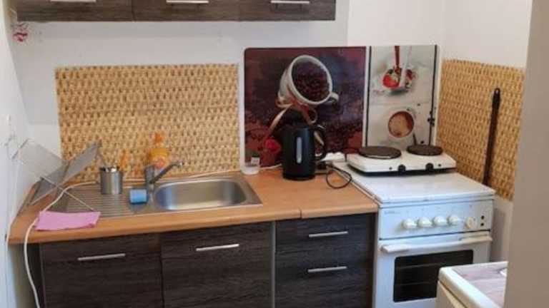 Die Ferienwohnung umfasst ein Schlafzimmer, eine Küche mit Kühlschrank und Ofen sowie ein Badezimmer mit Dusche. Handtücher und Bettwäsche werden bereitgestellt.
