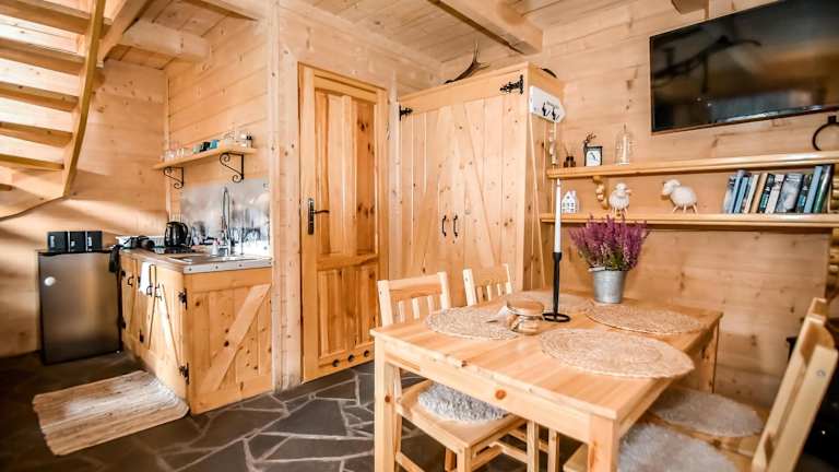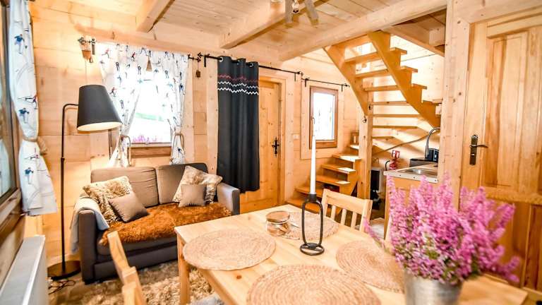 Das Chalet besteht aus einem Schlafzimmer, einem Wohnzimmer, einer voll ausgestatteten Küchenzeile mit Kühlschrank und Wasserkocher sowie einem Badezimmer mit Dusche und Haartrockner. Handtücher und Bettwäsche werden bereitgestellt.