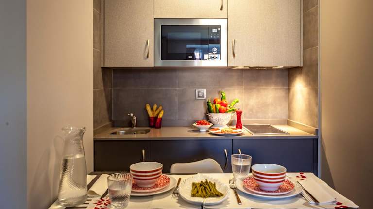 Die modernen Studios sind optimal ausgestattet mit einer voll ausgestatteten Küche, einem Arbeitsbereich, einem Flachbild-Sat-TV und einem Sofa. Jedes Zimmer hat zudem ein eigenes Bad mit kostenfreien Pflegeprodukten und einer Dusche. Elegante Zimmer verfügen über eine Minibar und Schallisolierung, um den Gästen eine ruhige und behagliche Atmosphäre zu bieten.