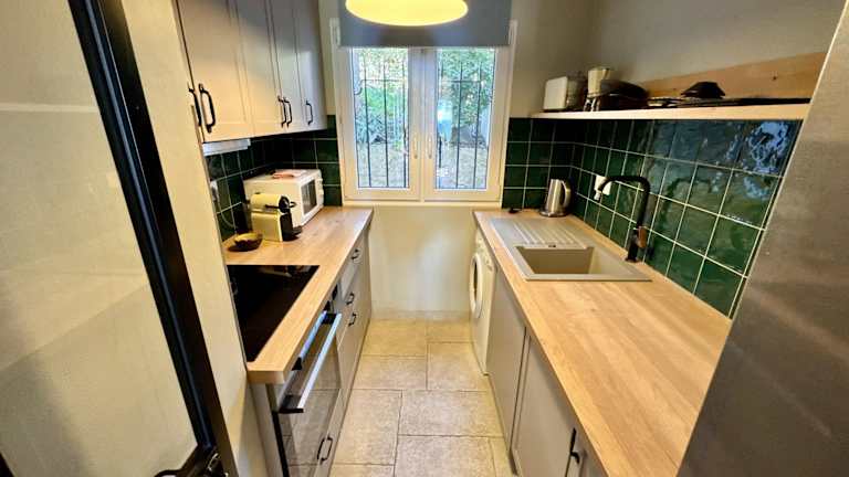 Die Ferienwohnung verfügt über zwei Schlafzimmer, ein Badezimmer und einen Essbereich. Zur Ausstattung gehören eine voll ausgestattete Küche, ein Flachbild-TV sowie Bettwäsche und Handtücher, die nach den Richtlinien der örtlichen Behörden gewaschen werden. Die Unterkunft ist mit schallisolierten Zimmern ausgestattet und bietet eine Terrasse mit Gartenmöbeln.