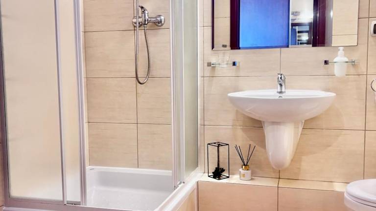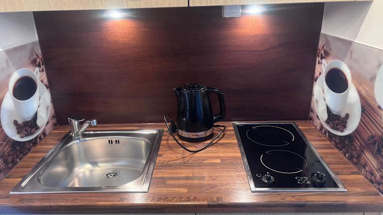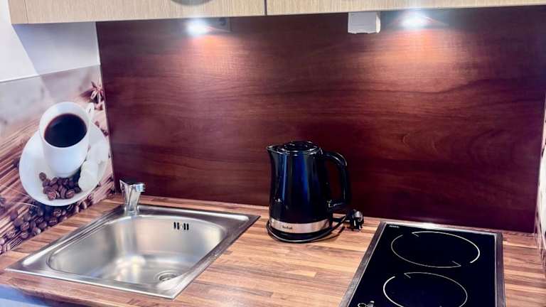 Die Ferienwohnung verfügt über ein Schlafzimmer, ein Badezimmer sowie über Bettwäsche und Handtücher. Zur Ausstattung gehören ein Flachbild-TV mit Kabelkanälen, ein Essbereich und eine voll ausgestattete Küchenzeile. Ein Balkon bietet Ausblick auf die Stadt.
