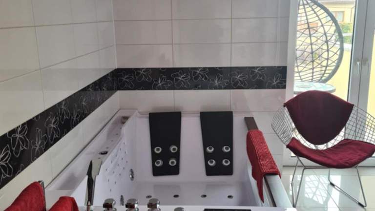 Die Ferienwohnung besteht aus einem Schlafzimmer, einem Wohnzimmer sowie einer voll ausgestatteten Küche mit Kühlschrank und Kaffeemaschine. Es gibt zwei Badezimmer, die mit einer Dusche und einem Whirlpool ausgestattet sind. Die Unterkunft bietet Handtücher und Bettwäsche nach den Richtlinien der örtlichen Behörden und ist klimatisiert.