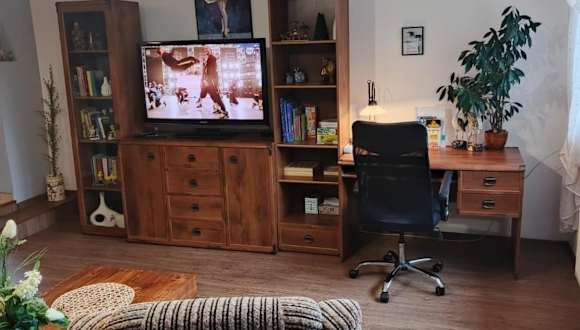 Die Ferienwohnung besteht aus einem Schlafzimmer, einem Wohnzimmer und einer voll ausgestatteten Küche mit Kühlschrank und Kaffeemaschine. Zudem gibt es ein Badezimmer mit Dusche und kostenlosen Pflegeprodukten. Handtücher und Bettwäsche werden bereitgestellt.