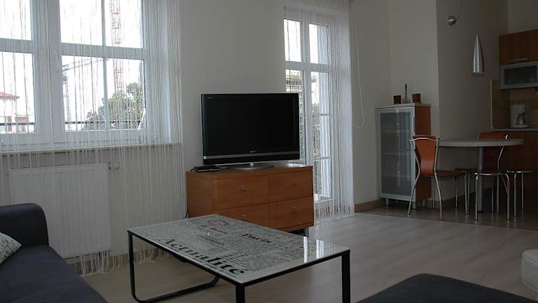 Das Apartment im Apartament Przy Promenadzie verfügt über ein gemütliches Schlafzimmer, einen Flachbild-Kabel-TV und eine voll ausgestattete Küche mit Kühlschrank und Kochfeld. Eine Waschmaschine steht ebenfalls zur Verfügung. Das Badezimmer ist mit einer Dusche ausgestattet. Für zusätzlichen Komfort gibt es eine Terrasse, auf der Sie entspannen können.