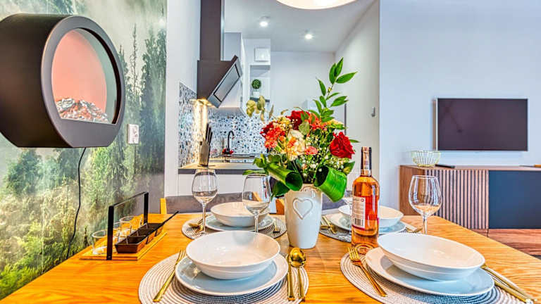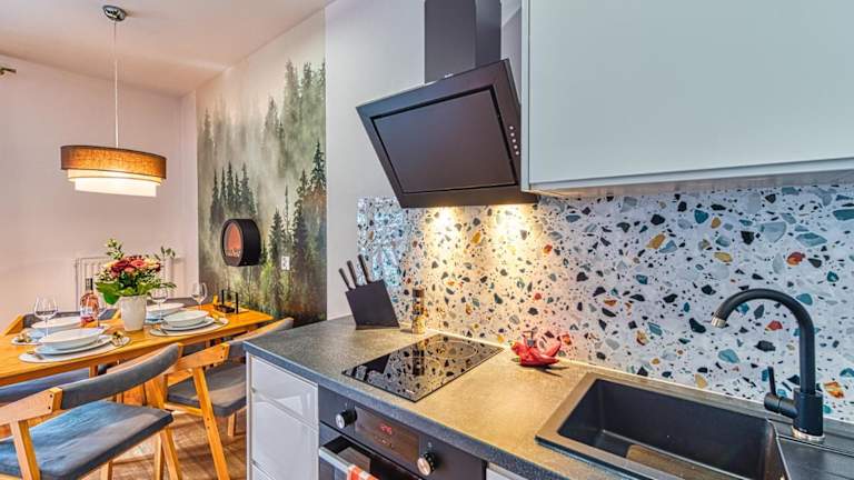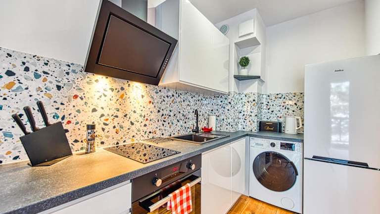 Die Ferienwohnung verfügt über ein Schlafzimmer und ist ausgestattet mit einem Flachbild-TV mit Kabelkanälen sowie einer voll ausgestatteten Küche, die einen Kühlschrank, Geschirrspüler, Waschmaschine, Ofen und Herdplatte beinhaltet. Handtücher und Bettwäsche sind vorhanden.