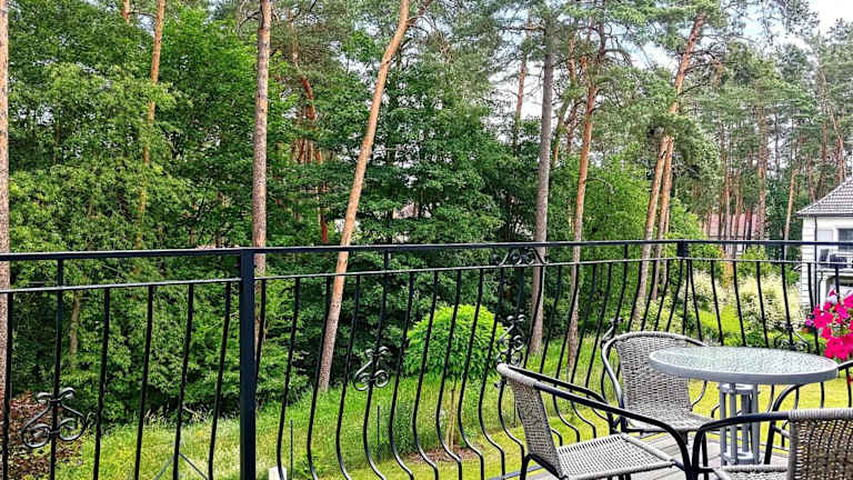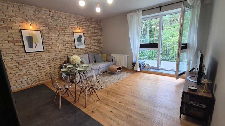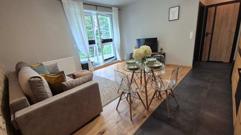 Die Unterkunft Apartament w Willii Szmaragd bietet eine heimelige Atmosphäre mit einem Balkon und einem Garten, ideal für entspannte Momente.