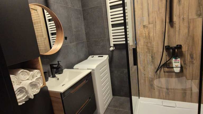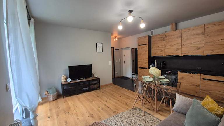 Die Ferienwohnung bietet ein Schlafzimmer, ein Wohnzimmer sowie eine gut ausgestattete Küchenzeile mit Kühlschrank und Geschirrspüler. Handtücher und Bettwäsche werden bereitgestellt.