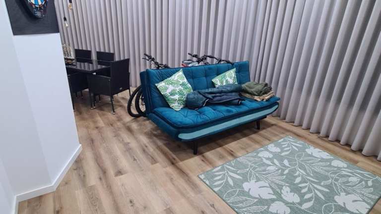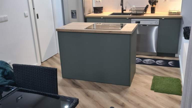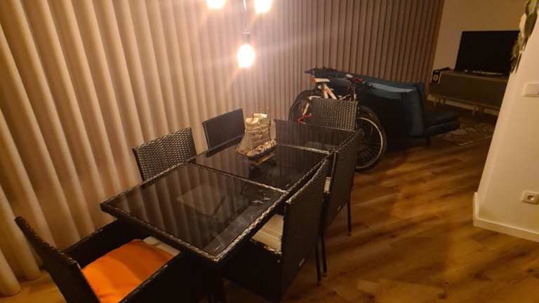 Die Ferienwohnung verfügt über eine gut ausgestattete Küche mit Kühlschrank, Geschirrspüler und Ofen sowie ein Wohnzimmer, einen Essbereich und ein Schlafzimmer. Es stehen zwei Badezimmer mit Dusche zur Verfügung. Handtücher und Bettwäsche werden bereitgestellt.