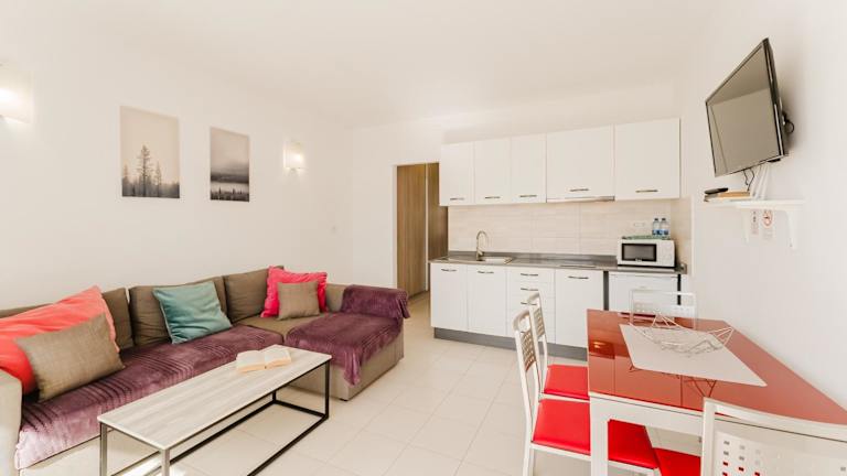 Die Unterkunft umfasst ein Schlafzimmer sowie ein Wohnzimmer mit einem Flachbild-TV. Die Ausstattung sorgt für ein heimeliges Umfeld und ist ideal für erholsame Ferien.