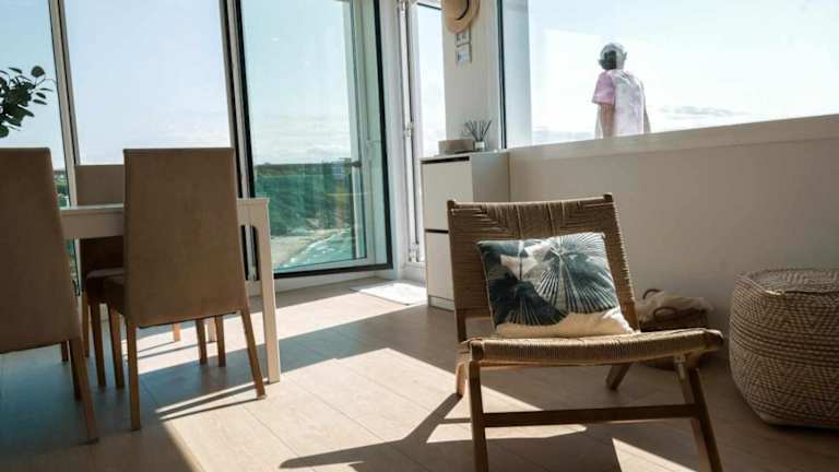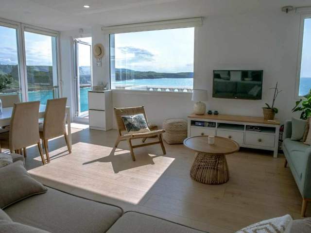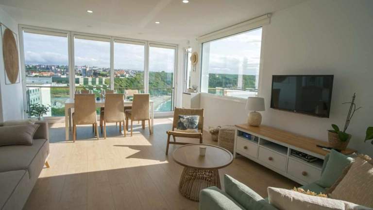 Die Ferienwohnung umfasst drei Schlafzimmer sowie zwei Badezimmer und ist mit Bettwäsche und Handtüchern ausgestattet. Ein Flachbild-TV mit Kabelkanälen, ein Essbereich und eine Terrasse mit Meerblick ergänzen die Ausstattung.