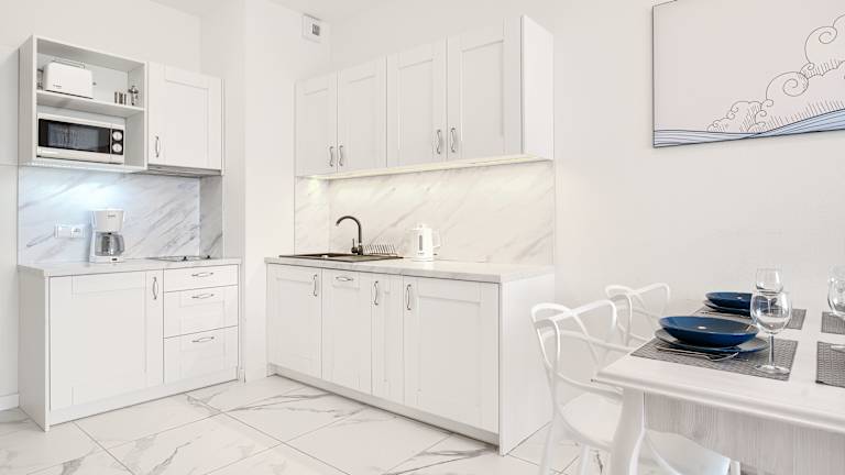 Die Unterkunft bietet eine voll ausgestattete Küchenzeile, die es Gästen ermöglicht, Mahlzeiten selbst zuzubereiten. Diese beinhaltet einen Kühlschrank, eine Kaffeemaschine, eine Herdplatte sowie einen Wasserkocher.