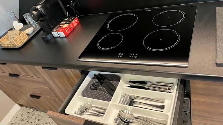 Die Wohnung ist mit einer komplett ausgestatteten Küche ausgestattet, die über einen Kühlschrank, Geschirrspüler, Ofen, Herdplatte, Kaffeemaschine und Wasserkocher verfügt. Es sind jedoch keine Informationen zu weiteren Verpflegungsmöglichkeiten vorhanden.