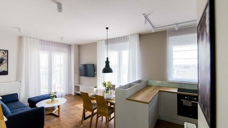 Jede Wohneinheit ist mit einem Schlafsofa, einem Sitzbereich, einem Flachbild-TV und einer gut ausgestatteten Küche mit Essbereich ausgestattet. Zudem gibt es ein eigenes Badezimmer mit Haartrockner. Einige Wohneinheiten verfügen über eine Terrasse und/oder einen Balkon mit Stadtblick.