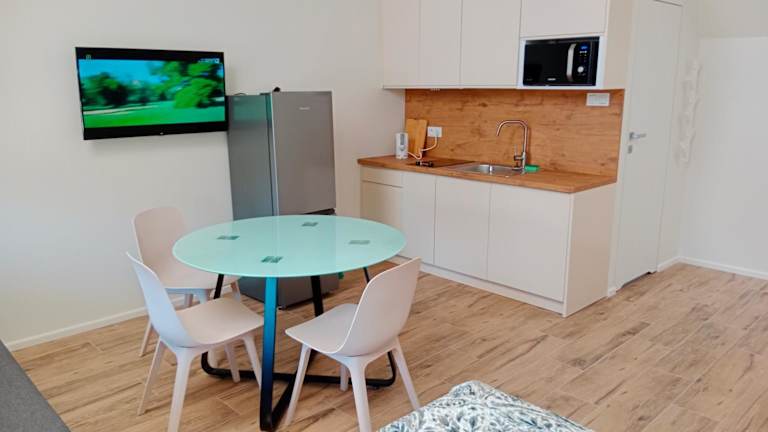 In einigen Wohneinheiten gibt es eine Küchenzeile, ausgestattet mit Kühlschrank, Mikrowelle und Herdplatte für die Zubereitung eigener Mahlzeiten. Keine weiteren Informationen zur Verpflegung vorhanden.