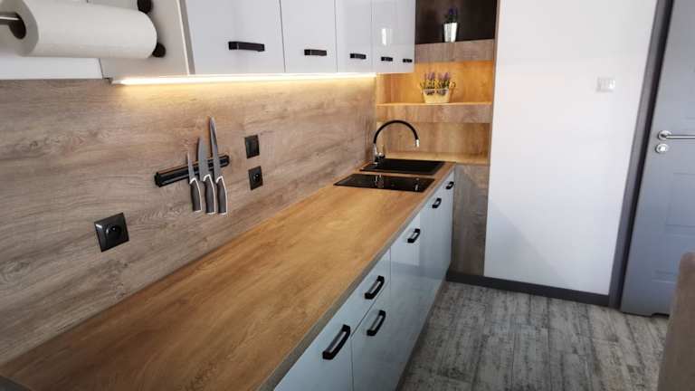 Die Appartements verfügen über eine Küche, die mit einem Kühlschrank, Geschirrspüler und Herdplatte ausgestattet ist.