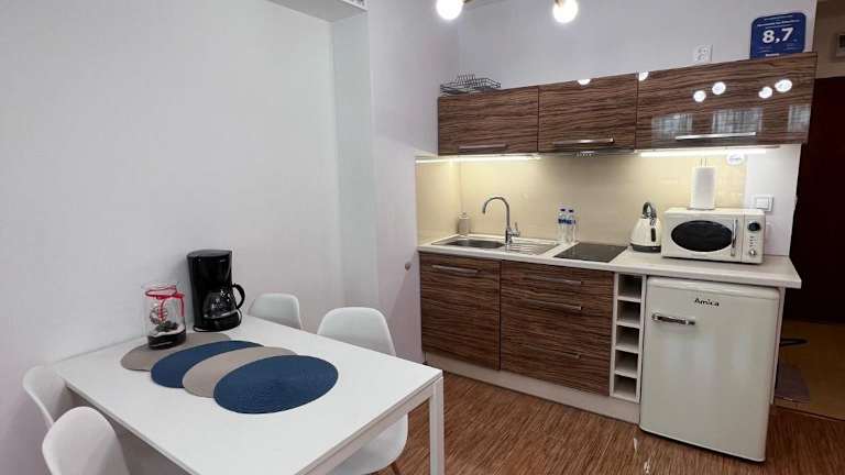 Die Wohneinheiten sind mit einer voll ausgestatteten Küchenzeile ausgestattet, die über einen Esstisch, Kühlschrank, Mikrowelle, Herdplatte sowie eine Kaffeemaschine und Wasserkocher verfügt, wodurch eine Selbstverpflegung möglich ist.