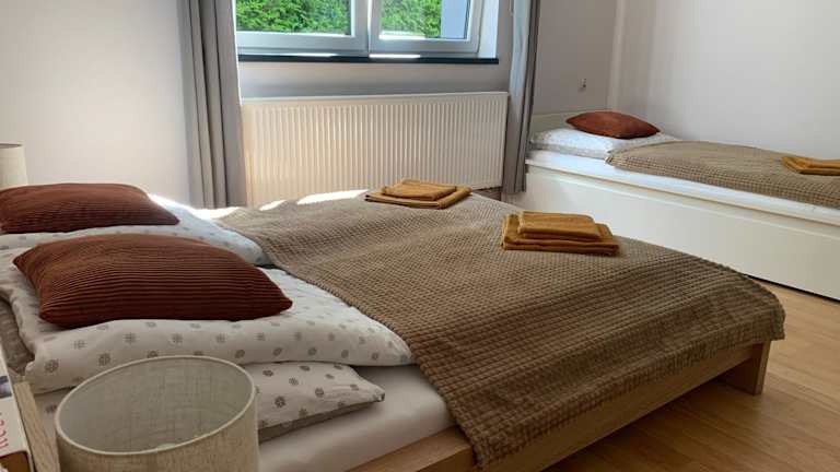 Die Ferienwohnung besteht aus einem Schlafzimmer, einer Küche, die mit einem Kühlschrank und einem Geschirrspüler ausgestattet ist, sowie einem Flachbild-TV und einem Sitzbereich. Das Badezimmer ist mit einer Dusche ausgestattet. Handtücher und Bettwäsche werden ebenfalls zur Verfügung gestellt.