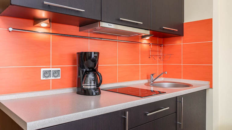 Es gibt eine voll ausgestattete Küchenzeile in den Apartments, die eine Mikrowelle, einen Kühlschrank und eine Kaffeemaschine umfasst, sodass die Gäste selbständig kochen können. Zudem stehen verschiedene Restaurants in der Nähe zur Verfügung. Der Minimarkt vor Ort bietet zusätzliche Verpflegungsmöglichkeiten.