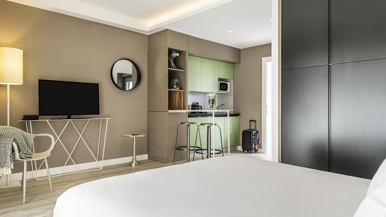 Die Zimmer sind mit Klimaanlage, Heizung, einem Balkon oder einer Terrasse sowie einem privaten Badezimmer ausgestattet. Zur Einrichtung gehören ein Doppelbett, ein Sofabett, ein Safe, eine Minibar, ein Schreibtisch sowie eine Kochnische mit Kühlschrank, Herd und Mikrowelle. Die Zimmer sind mit WLAN (ohne Gebühr), einem TV-Gerät und weiteren Annehmlichkeiten ausgestattet.