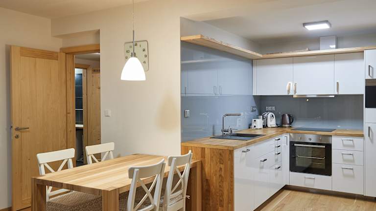 Die Residence Kovárna verfügt über insgesamt 6 Zimmer, die alle mit einer Küche ausgestattet sind. Die Zimmer bieten auch Annehmlichkeiten wie einen Flachbildfernseher und einen Wasserkocher mit Kaffee-/Teezubehör. Jedes Zimmer verfügt über einen eigenen Balkon oder eine Terrasse, auf der Sie den schönen Ausblick genießen können.
