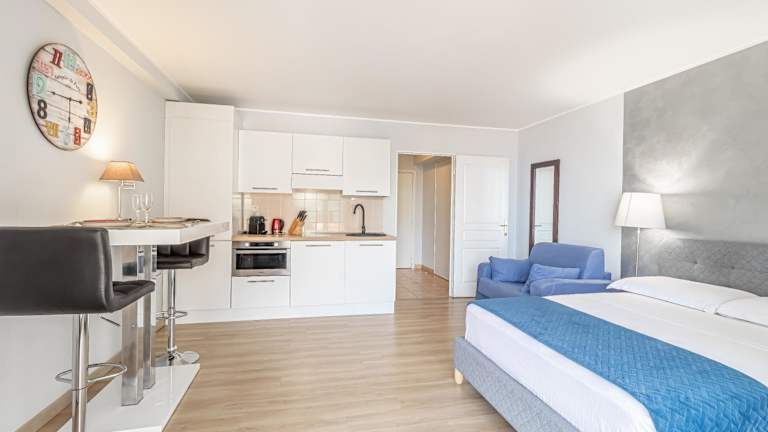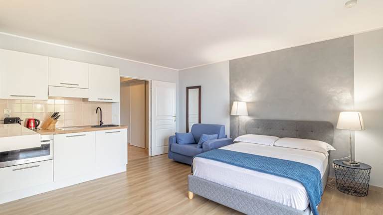 Die klimatisierten Zimmer sind mit einer individuell steuerbaren Heizung sowie speziellen Annehmlichkeiten ausgestattet. Einige Zimmer verfügen über einen Balkon oder eine Terrasse mit Meerblick. Die Zimmer sind mit einem Doppelbett oder einem Sofabett ausgestattet, zudem stehen separate Schlafzimmer zur Verfügung. Die Kochnische ist mit einem Kühlschrank, einer Mikrowelle sowie einer Tee-/Kaffeemaschine ausgestattet. Weitere Annehmlichkeiten umfassen ein Bügelset, ein Telefon, einen Fernseher mit Satelliten-/Kabelempfang und kostenfreies Wifi. Die Badezimmer sind jeweils mit Dusche und Badewanne sowie einem Haartrockner ausgestattet. Es stehen insgesamt 92 Nichtraucherzimmer zur Verfügung.