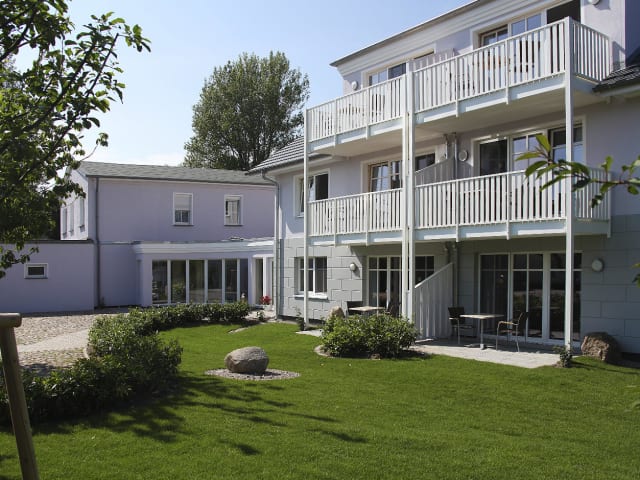 · weiter Blick auf Bodden und Wiesen · lichtdurchflutete Wohnbereiche · hochwertige Einbauküchenzeile mit Ceranherd, Backofen, Kühlschrank, Geschirrspüler, Toaster, Teekocher, Senseo Kaffeemaschine mit Pass und Koch- und Essgeschirr · Essecke mit einer gemütlichen Sitzgarnitur · TV-Sat und W-LAN · drei Apartments verfügen über einen Kamin · großzügige Bäder mit Fußbodenheizung, Dusche/WC und Fön · Waschmaschinenraum mit Trockner im EG (entgeltlich)