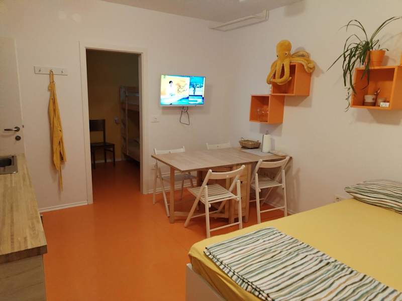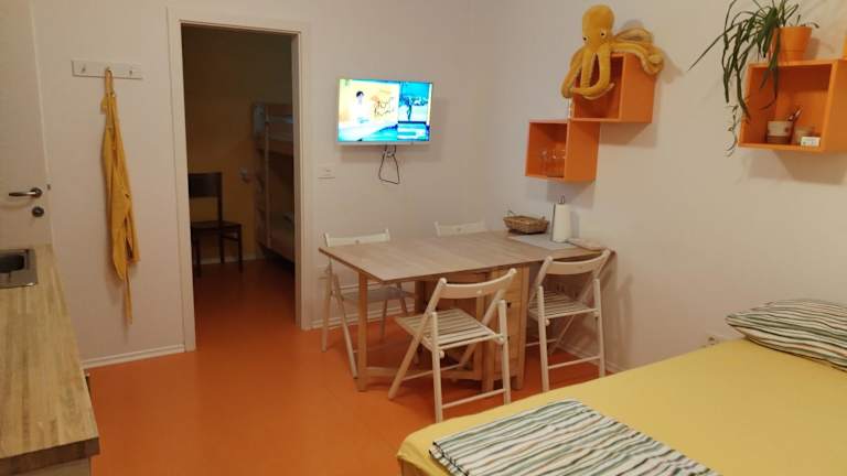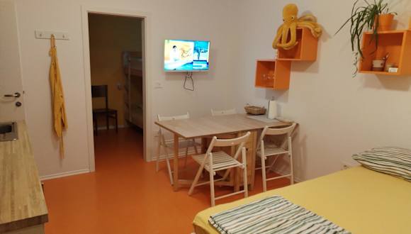 Die Ferienwohnung besteht aus 1 Schlafzimmer, einem Wohnzimmer und einer voll ausgestatteten Küche mit Kühlschrank und Wasserkocher. Ein Badezimmer mit Dusche und kostenlosen Pflegeprodukten ist ebenfalls vorhanden. Handtücher und Bettwäsche werden gestellt.