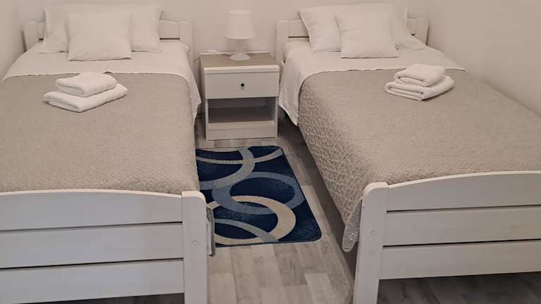 Die Ferienwohnung besteht aus 2 Schlafzimmern, einem Wohnzimmer, einer voll ausgestatteten Küche mit Kühlschrank und Kaffeemaschine sowie einem Badezimmer mit Badewanne oder Dusche und Whirlpool. Handtücher und Bettwäsche werden bereitgestellt.