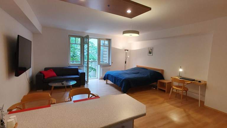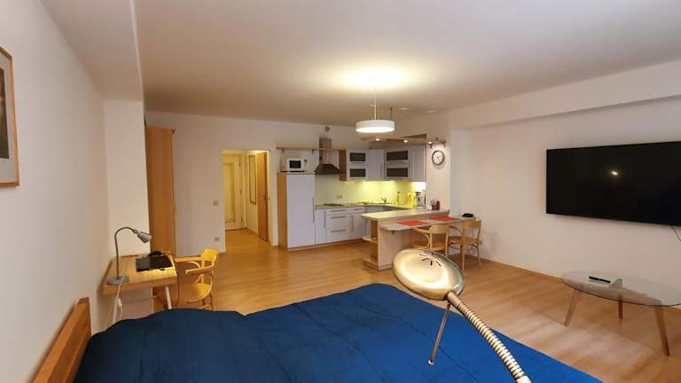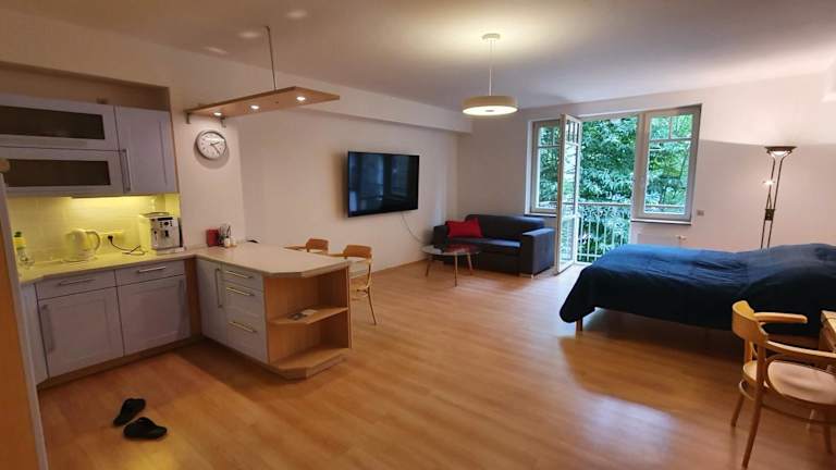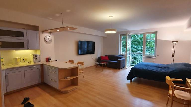 Die Ferienwohnung verfügt über 1 Schlafzimmer, 1 Badezimmer, eine voll ausgestattete Küchenzeile und einen Balkon mit Stadtblick. Zur Ausstattung zählen Bettwäsche, Handtücher und ein Flachbild-TV mit Satellitenkanälen. Die Zimmer sind schallisoliert und bieten Bequemlichkeiten für einen erholsamen Aufenthalt.