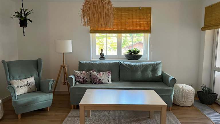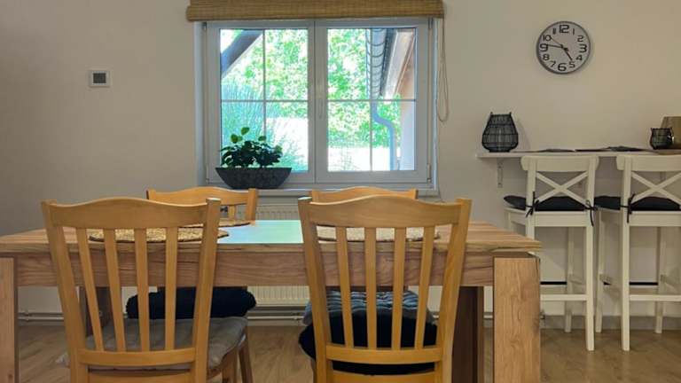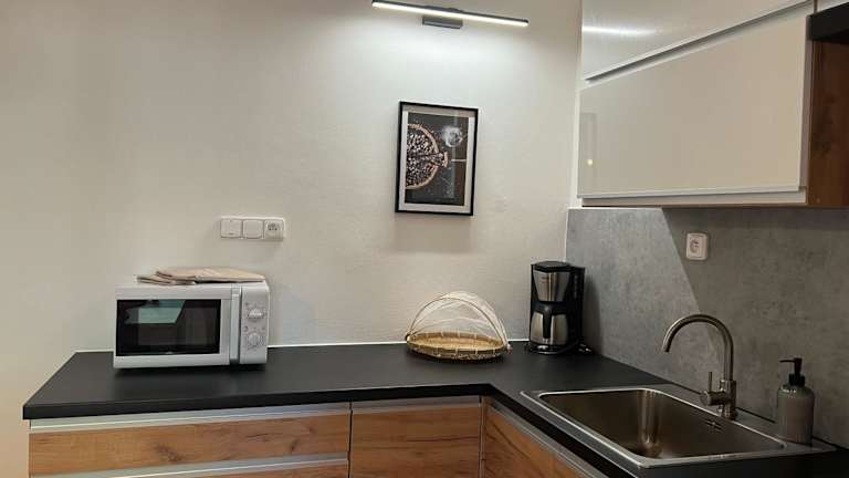 Die Küche ist ausgestattet mit einem Kühlschrank, einem Ofen, einer Mikrowelle, einer Kaffeemaschine und einem Wasserkocher, was eine Selbstverpflegung ermöglicht.