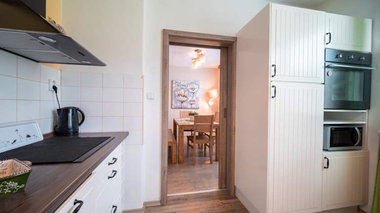 Die Ferienwohnung verfügt über ein Schlafzimmer und ein Wohnzimmer, das mit einem Flachbild-TV ausgestattet ist. Die voll ausgestattete Küche beinhaltet einen Kühlschrank und einen Geschirrspüler. Ein Badezimmer mit Dusche ist ebenfalls vorhanden. Handtücher und Bettwäsche werden bereitgestellt.