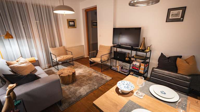Die Ferienwohnung besteht aus einem Schlafzimmer, einem Wohnzimmer und einer voll ausgestatteten Küche mit Kühlschrank und Kaffeemaschine. Ein Badezimmer mit Bidet und Dusche ist ebenfalls vorhanden. Handtücher und Bettwäsche werden bereitgestellt.