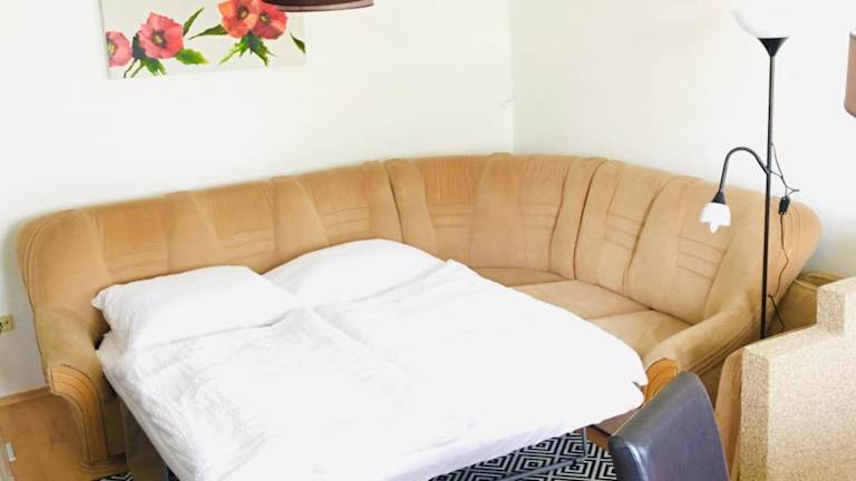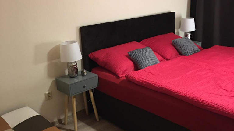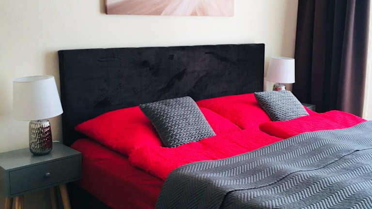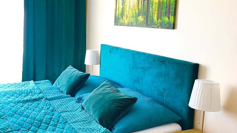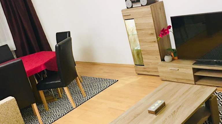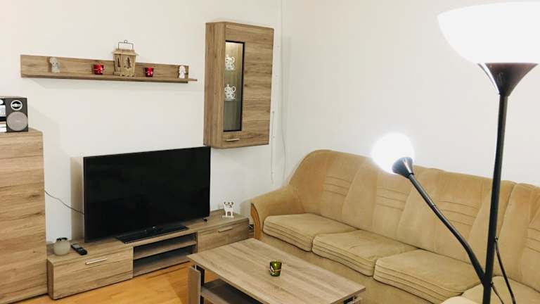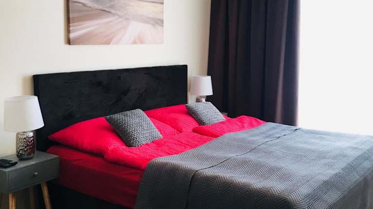 Die Ferienwohnung umfasst zwei Schlafzimmer, ein Wohnzimmer und ein Badezimmer mit einer Badewanne. Zudem steht ein Balkon mit Stadtblick zur Verfügung. Die gut ausgestattete Küche beinhaltet einen Kühlschrank und einen Geschirrspüler. Handtücher und Bettwäsche werden bereitgestellt.
