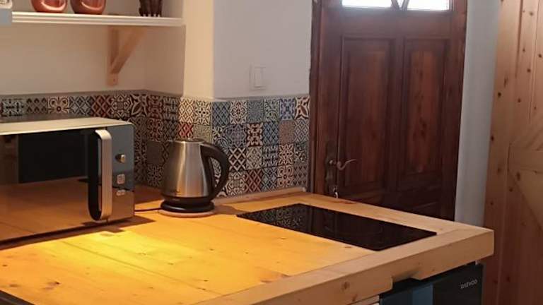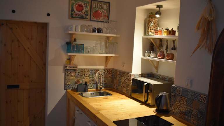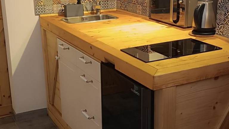 Die Ferienwohnung ist mit einer Küchenzeile ausgestattet. Diese beinhaltet einen Kühlschrank sowie eine Mikrowelle, was Selbstverpflegung ermöglicht. Für Snacks oder kleinere Mahlzeiten könnte die Umgebung zusätzliche Möglichkeiten bieten.