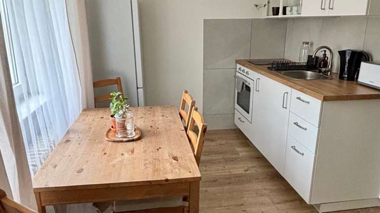 Die Ferienwohnung bietet ein Schlafzimmer sowie eine voll ausgestattete Küche, die mit einem Kühlschrank und einem Ofen ausgestattet ist. Des Weiteren umfasst die Unterkunft ein Badezimmer mit Badewanne und kostenlosen Pflegeprodukten. Handtücher und Bettwäsche werden gestellt.