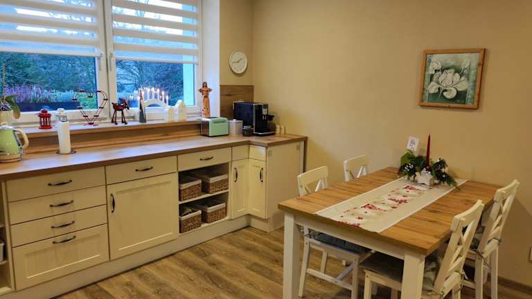 Die Ferienwohnung besteht aus zwei Schlafzimmern, einem heimeligen Wohnzimmer sowie einer voll ausgestatteten Küche, die mit einem Kühlschrank und einer Kaffeemaschine ausgestattet ist. Zudem steht ein Badezimmer mit einer Dusche und einem Haartrockner zur Verfügung. Handtücher und Bettwäsche werden bereitgestellt.