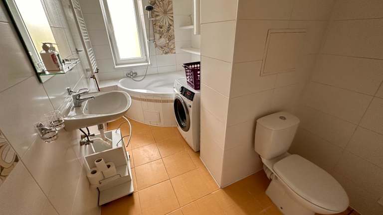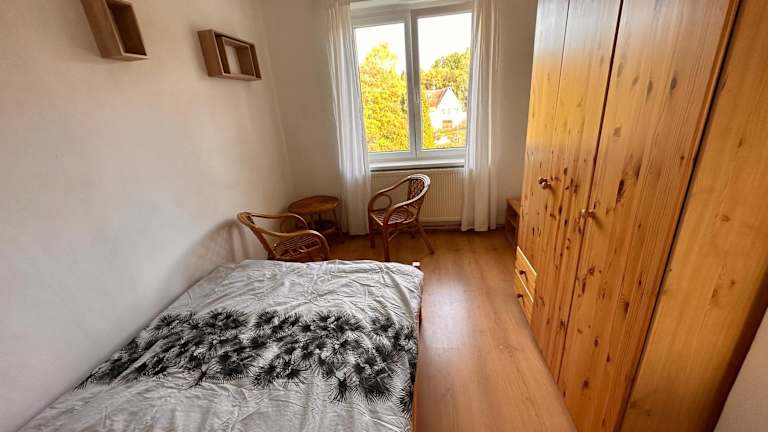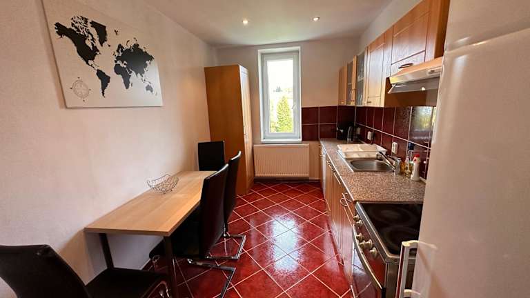 Die Ferienwohnung besteht aus einem Schlafzimmer, einem Wohnzimmer, einer voll ausgestatteten Küche mit Kühlschrank und Kaffeemaschine sowie einem Badezimmer mit Dusche und Badewanne. Handtücher und Bettwäsche werden bereitgestellt.