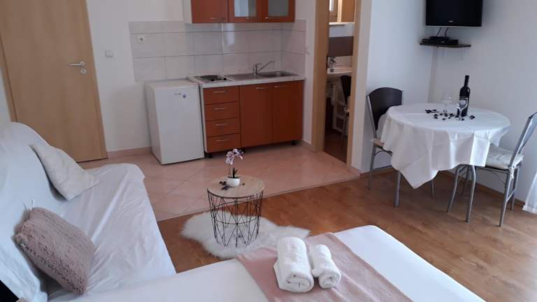 Apartmani Marino bietet eine heimelige Atmosphäre mit einem Garten, einer Terrasse sowie Grillmöglichkeiten. Die Unterkunft wird von einem privaten Gastgeber geführt und legt besonderen Wert auf Sauberkeit und Sicherheit. Die Empfangszeiten sind von 14:00 bis 23:30 Uhr und der Check-out ist von 06:00 bis 10:00 Uhr möglich. Für Gäste, die mit dem Flugzeug anreisen, besteht die Möglichkeit eines kostenpflichtigen Flughafentransfers vom und zum 30 km entfernten Flughafen Zadar.