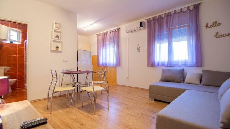 Die Unterkunft Apartmani Perkovic bietet eine Terrasse, einen Sitzbereich, einen Satelliten-TV sowie ein eigenes Badezimmer mit einer Dusche und einem Haartrockner.